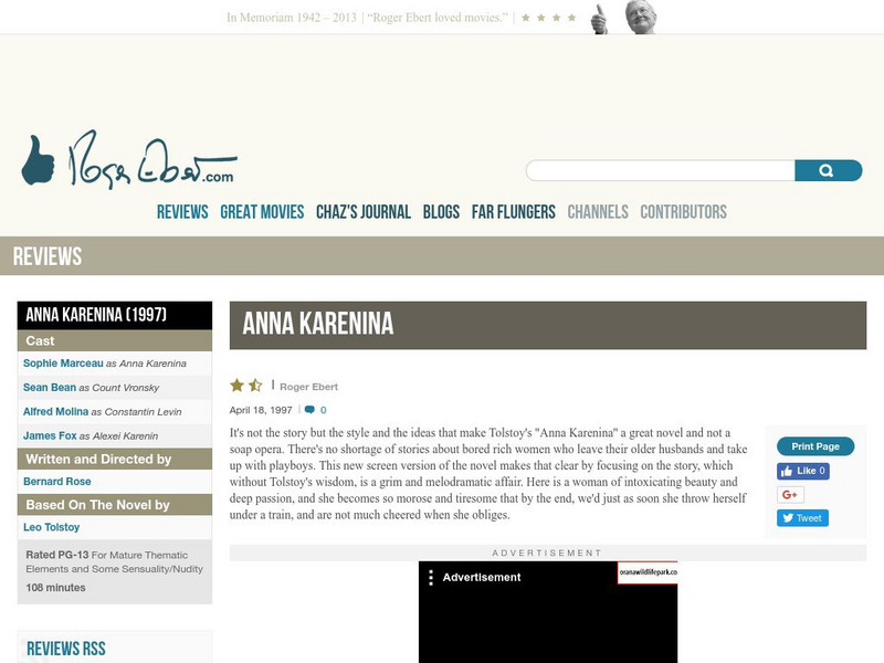 Roger Ebert, film critic for the Chicago Sun-Times, reviews the 1997 film version of Leo Tolstoy's classic novel Anna Karenina. The movie starred Sophie Marceau and Sean Bean as Anna and Vronsky.