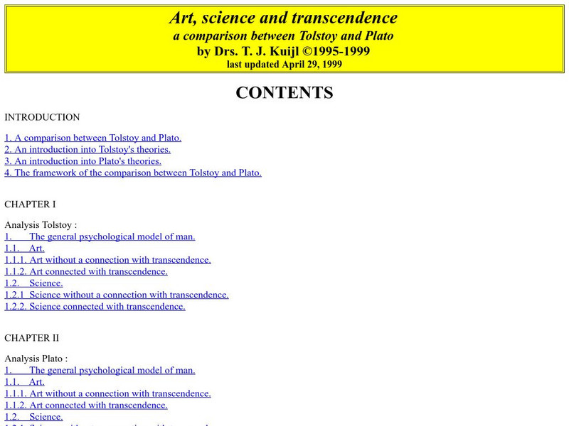 "Art, Science, and Transcendence: A Comparison Between Tolstoy and Plato" is the full text of a scholarly article written by Dr. T.J. Kuijl. For serious students of Tolstoy.