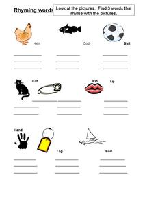 In this recognizing words that have rhyming patterns worksheet, students observe nine illustrated words and write three words that rhyme with each of them. Students write 27 answers.