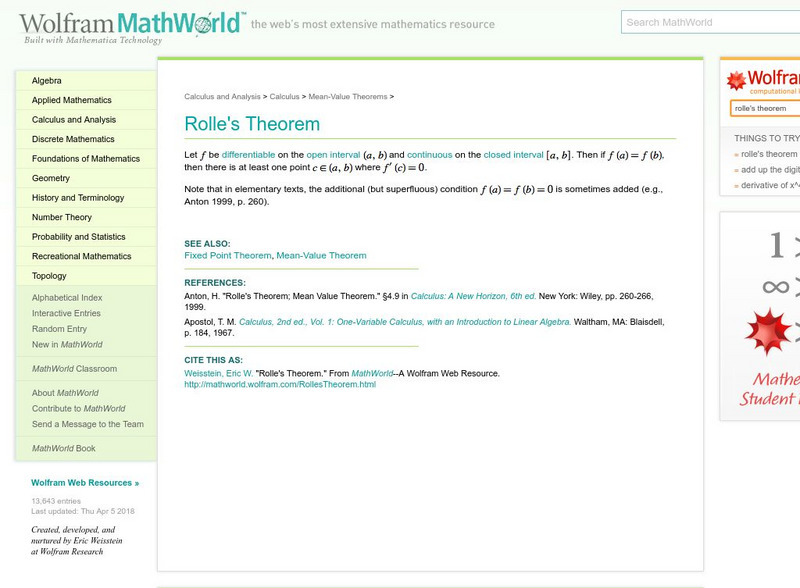 MathWorld provides a brief description of the Rolle's Theorem. Click on any of the highlighted words to further understand the material.
