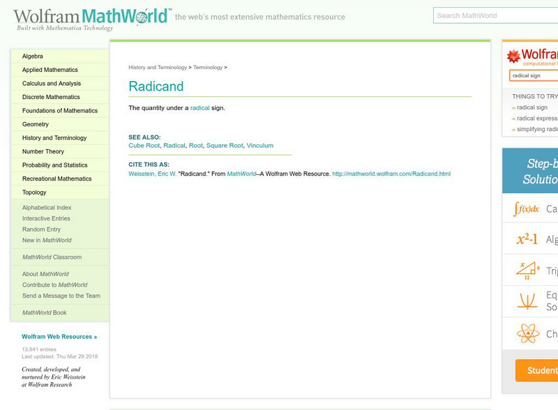 Learn about radicands with this reference guide. Provides a detailed definition and examples.