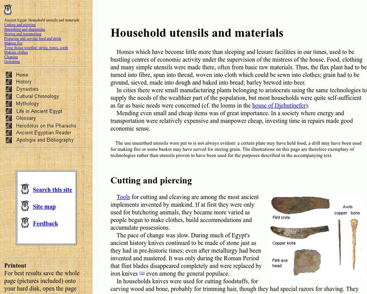 A fascinating look inside the home of a common Egyptian to see the utensils needed for running a household. Read about the containers, tools, pottery, and sewing tools.