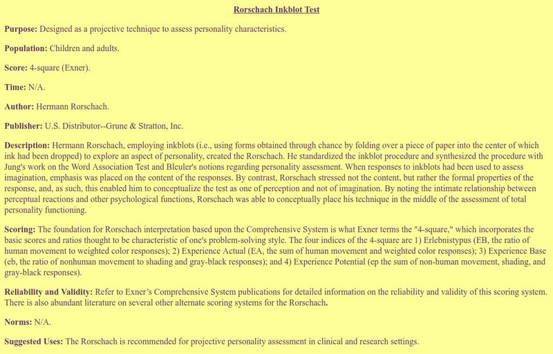 The Nova Southeastern University provides information on the Rorschach Inkblot Test. Includes description, scoring, reliability and validity and more.