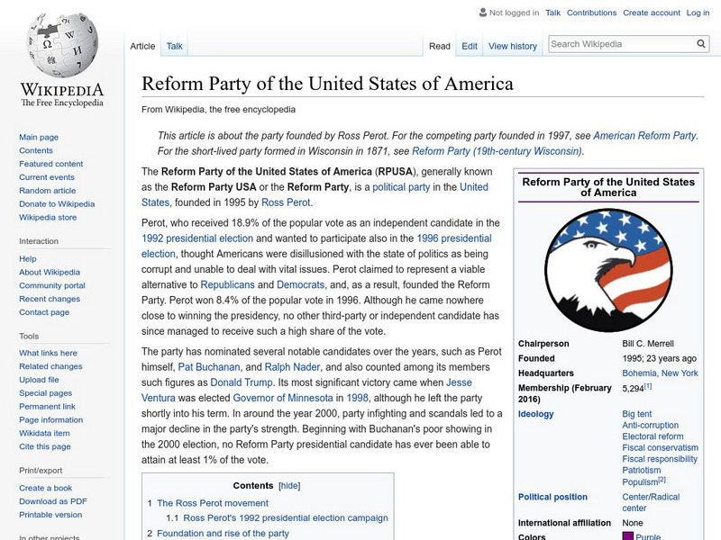 This Wikipedia encyclopedia entry for Ross Perot's 1992 third-party presidential bid and his Reform Party of the 1990s provides history, platform issues, and related information and links.