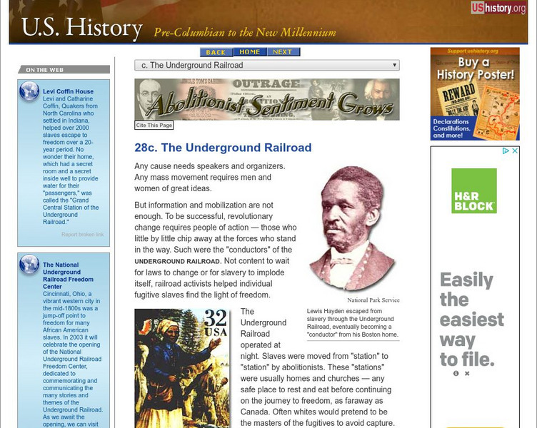 A brief look at the Underground Railroad and how it operated. Find some of the code words used to help runaway slaves find their way, and read about some of the "conductors" who led slaves along the routes to the North.