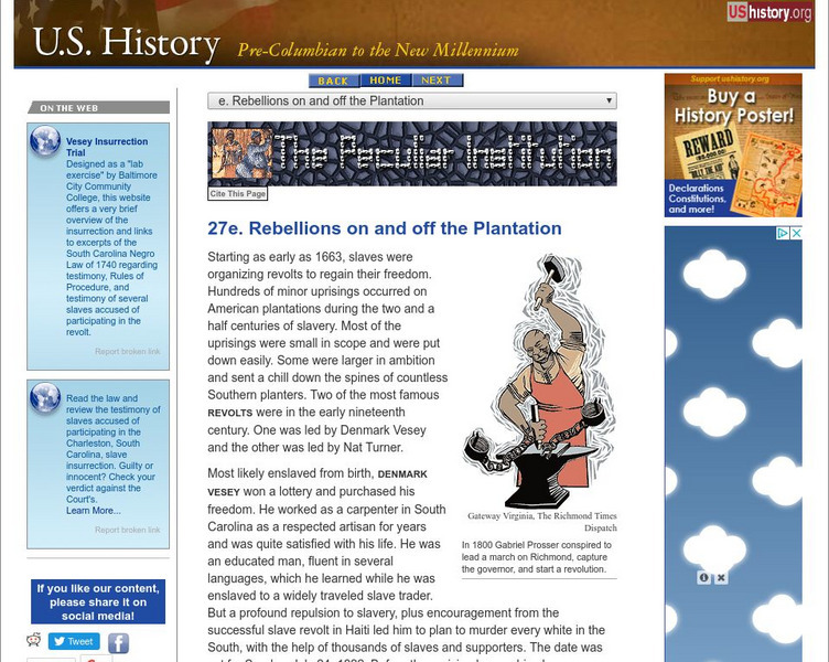 Slaves resisted their bondage in many ways. Read about the revolts planned and executed by Denmark Vesey and Nat Turner, the southern reactions to those revolts, and the ways slaves individually resisted their enslavement.