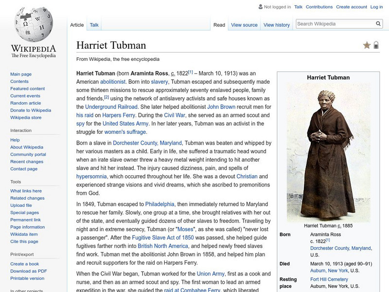 This article overviews Harriet Tubman's involvement with the Underground Railroad, her service in the military during the Civil War, and her fight as an activist for African-American and women's rights.