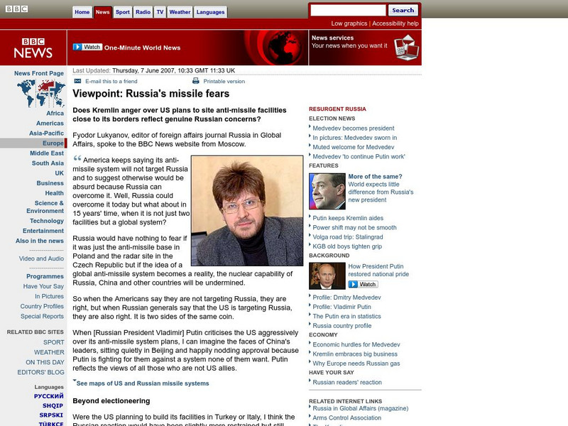 From the pages of the BBC an analysis of Russian opposition to the proposed American missile defense system by Fyodor Lukyanov, a journalist who specializes in foreign affairs. Provides interesting reactions to the analysis from around...