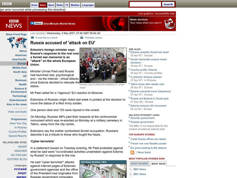 A May 2007 news report on the developing tensions between Russia and Estonia over the decision to move a WWII war memorial to Russian troops in Tallin.