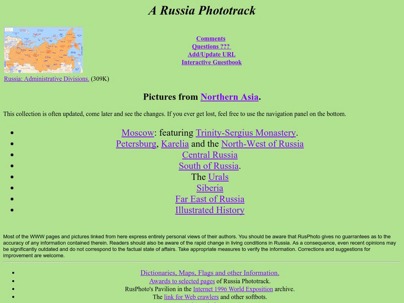A large collection of pictures related to Russia. Click on the region you are interested in, then read the site notes to determine which photos you would like to see.
