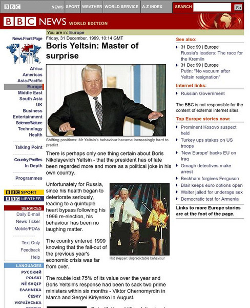 This article is dated December 31, 1999, Yeltsin before Yeltsin surprised the world by resigning from the presidency. It talks about the problems that Russia Yeltsin under Yeltsin, and how unpredictable his behavior had become. There is...