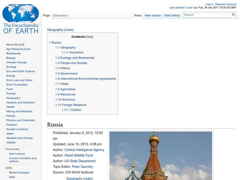 The Encyclopedia of Earth provides an overview of Russian Federation, including its geography, natural resources, history, government, economy, and much more. Maps and images are also included, along with sources used to create the entry.