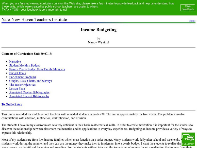 This site contains a unit on budgeting money for use by middle school teachers. Includes enrichment problems, a bibliography, and many example problems and situations.