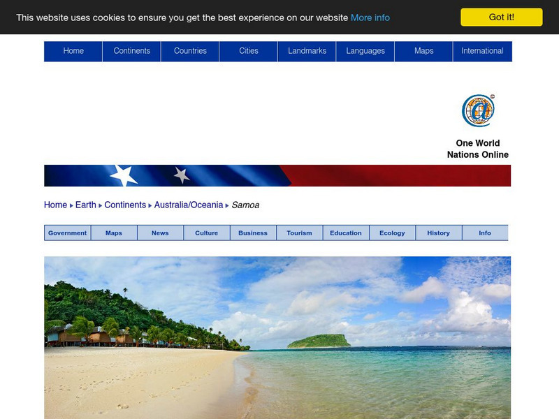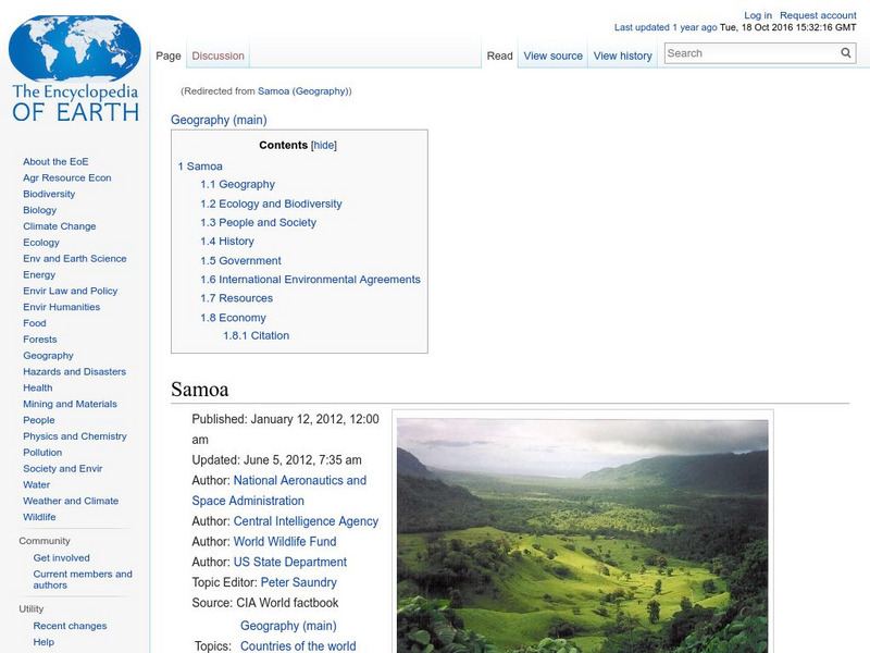 The Encyclopedia of Earth provides an overview of Samoa, including its geography, natural resources, history, government, economy, and much more. Maps and images are also included, along with sources used to create the entry.