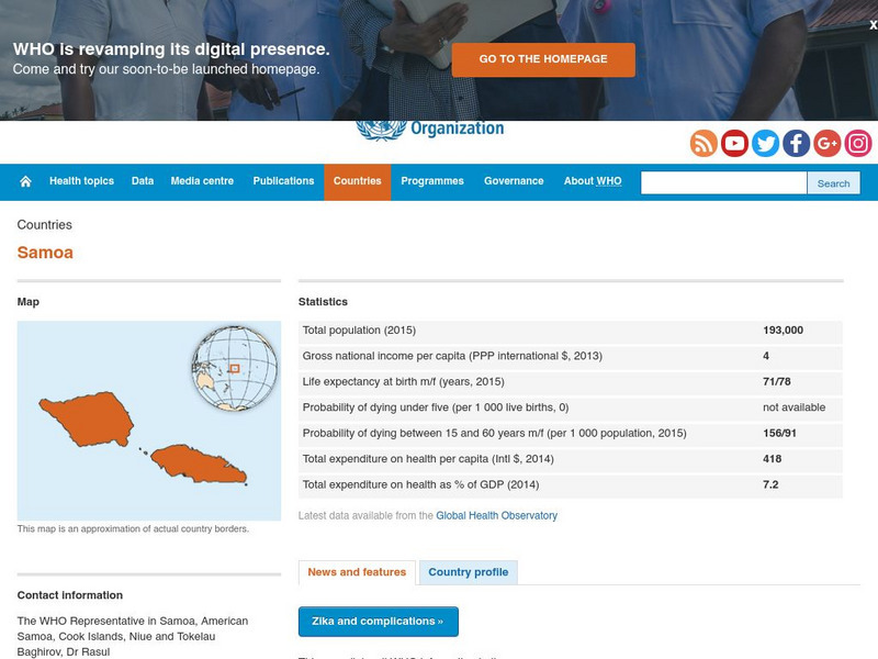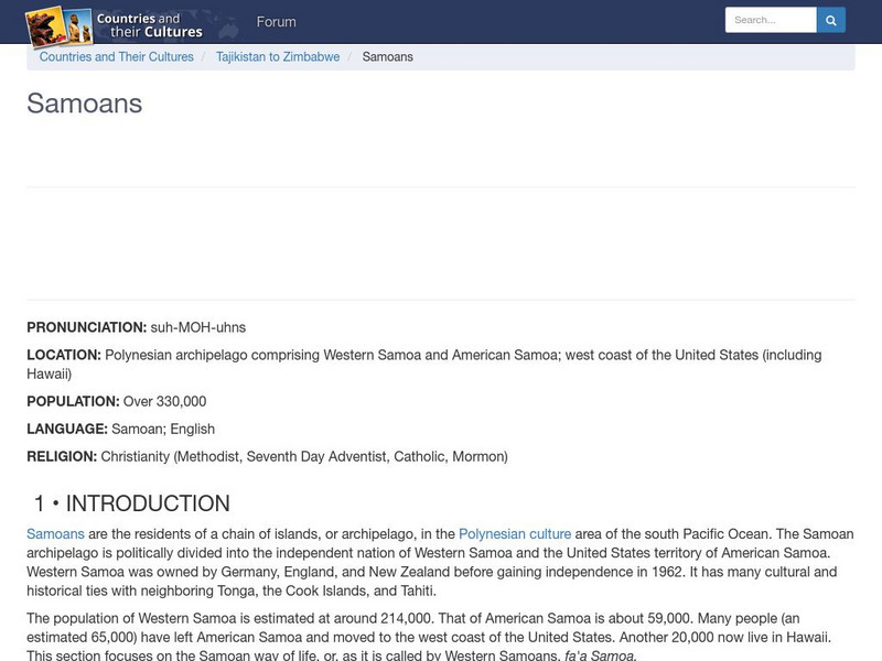 Good reference tool that gives you a virtual destination guide, country profile, and background information on the Polynesian islands of Samoa. Also, provides links to sources with comprehensive information on art, culture, people,...