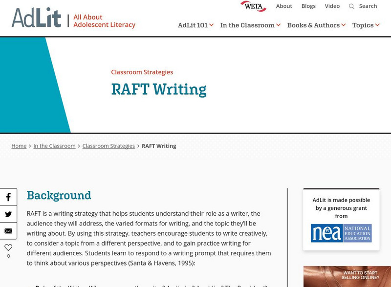 RAFT is a writing strategy that helps students understand their role as a writer, the audience they will address, the varied formats for writing, and the topic they'll be writing about. By using this strategy, teachers encourage students...