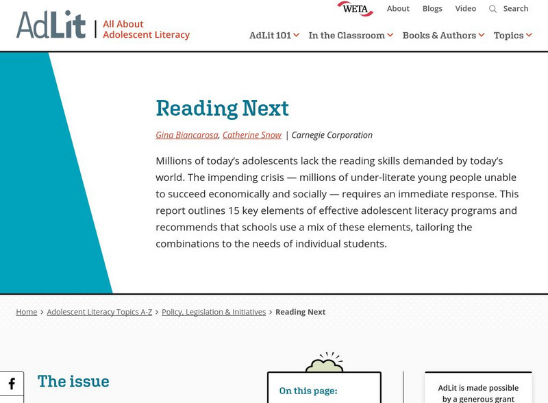 Millions of today's adolescents lack the reading skills demanded by today's world. The impending crisis - millions of under-literate young people unable to succeed economically and socially - requires an immediate response. This report...
