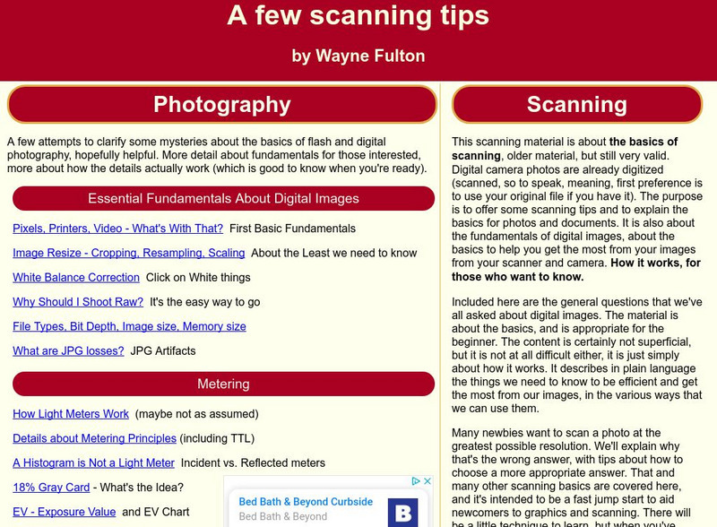 Wayne Fulton provides basic information on how to use a scanner for both photos and documents. Included are a question and answer section, a list of basic scanner software, ways to improve your scanning, and links to other scanner sites.