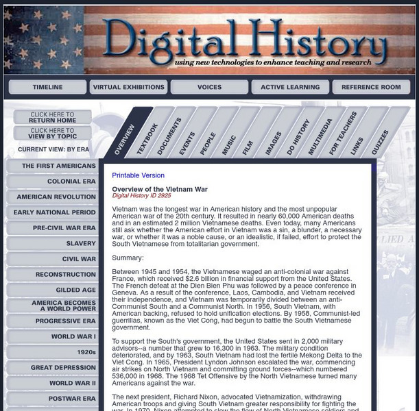 This resource presents a concise history of US involvement in Vietnam. It provides detailed information about the controversial military action. The article examines early US involvement, escalation, and withdrawal.
