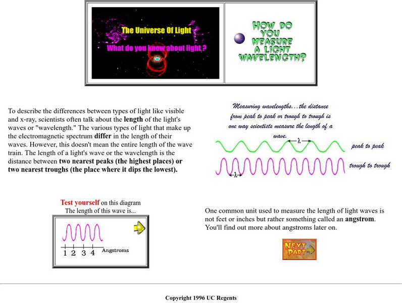 Cool science site tests your knowledge of light by exploring the question: "How do you measure a light wavelength?" Allows users to test themselves as well as provides additional activities on wavelength and amplitude.