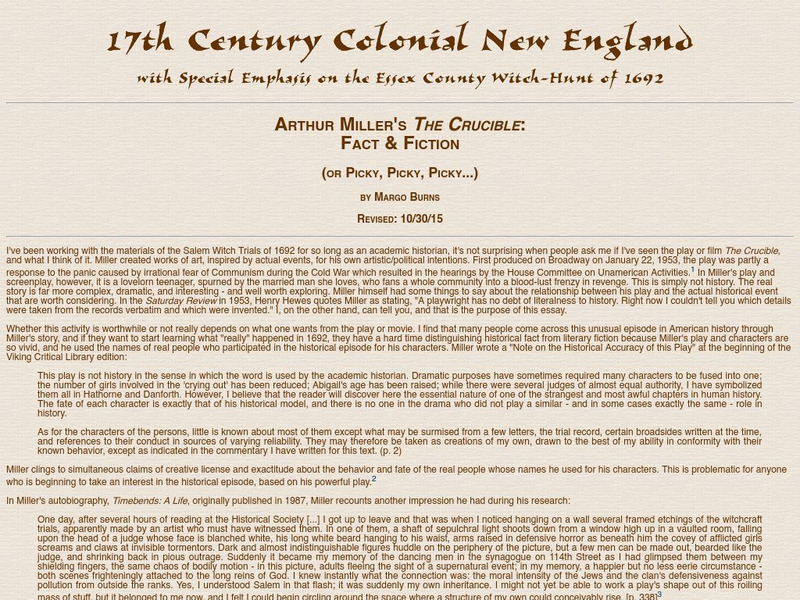 This personal website provides an essay by Margo Burns, whose interest lies in 17th Century New England (particularly the Salem Witch Trials). The essay focuses on separating the facts from the fictional depiction of Miller's...