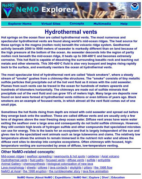 NeMO is a seafloor observatory at an active underwater volcano! NeMO "background" is a great place to begin your scientific journey under the sea. Site includes virtual tours, daily updates from the sea, teacher resources and more.