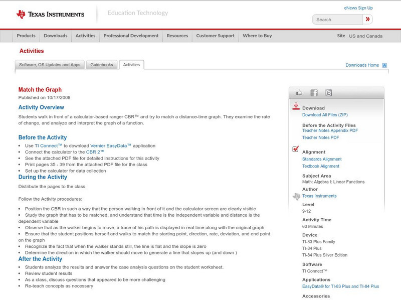 In this activity, students walk in front of a calculator-based ranger CBR and try to match a distance-time graph. They examine the rate of change, and analyze and interpret the graph of a function.