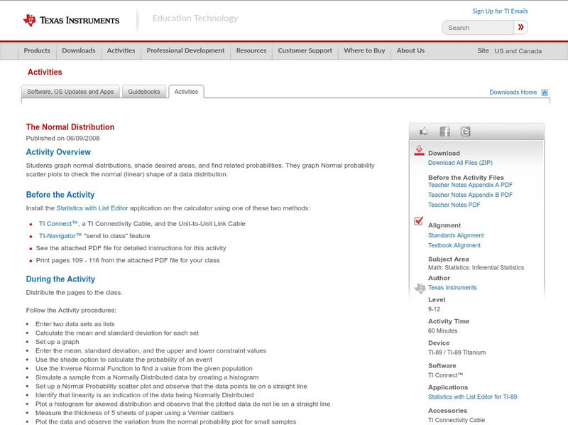 Students graph normal distributions, shade desired areas, and find related probabilities. They graph Normal probability scatter plots to check the normal (linear) shape of a data distribution.