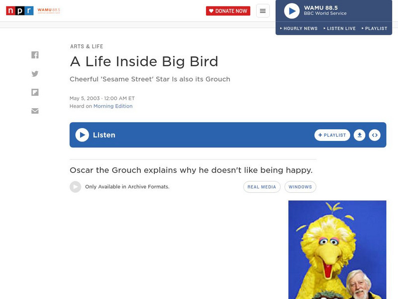 Complete with audio and video links, this NPR web page tells the story of the puppeteer who is the voice and movement of Big Bird and Oscar the Grouch, Caroll Spinney. Includes excerpts from Spinney's autobiography. This site has lots of...