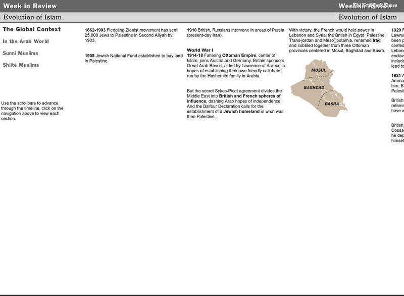 Interactive media timeline that gives a brief description of Islam, the spread of Islam, the different Islamic groups, and the conflict in the Middle East.
