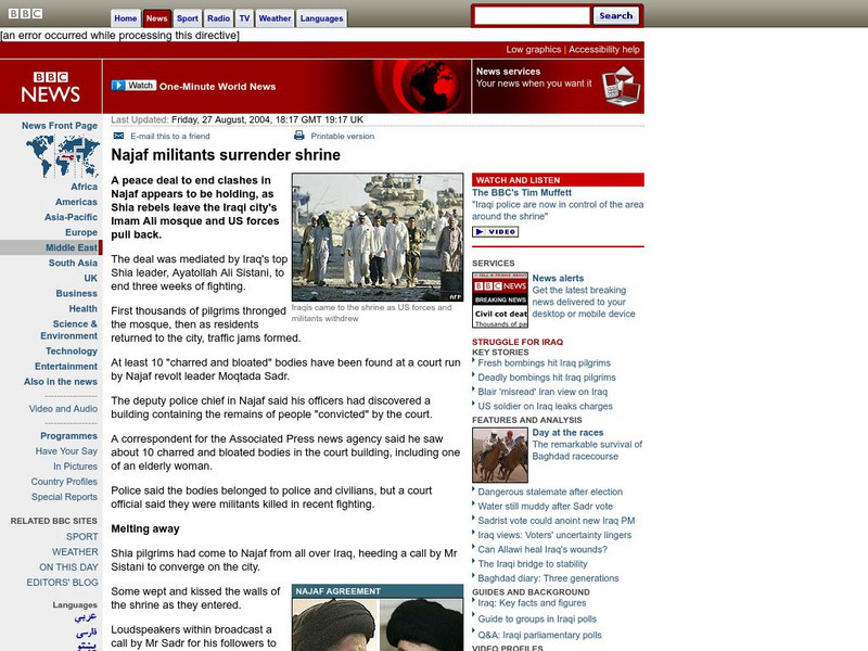 Article reports on the chaotic circumstances surrounding Najaf as militants clash in this holy city. 8/27/04