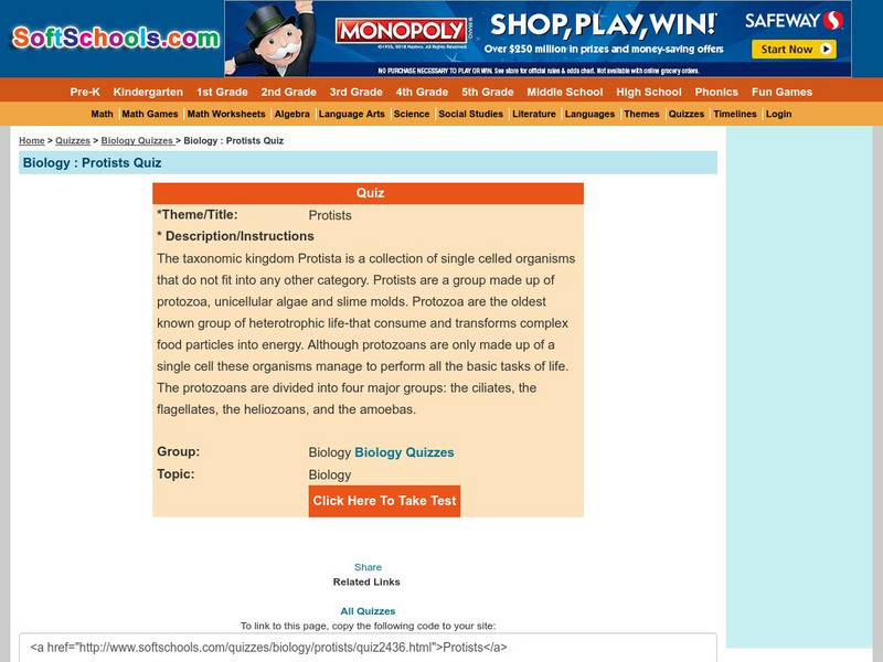 Take this interactive, multiple-choice quiz over protists, then review your score and any missed questions at the end.