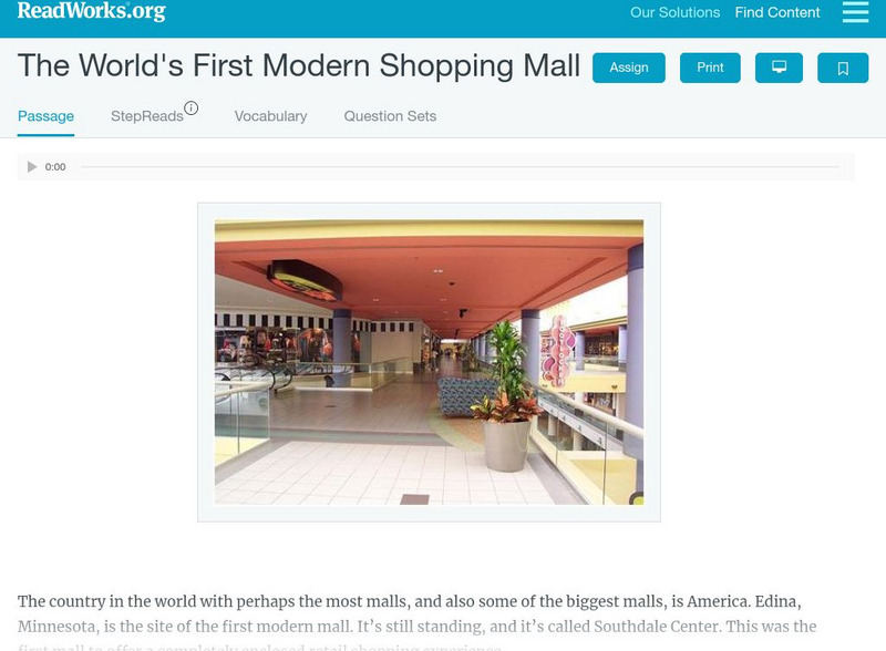 [Free Registration/Login Required] An informational text about the world's first shopping mall. A question sheet is available to help students build skills in reading comprehension.