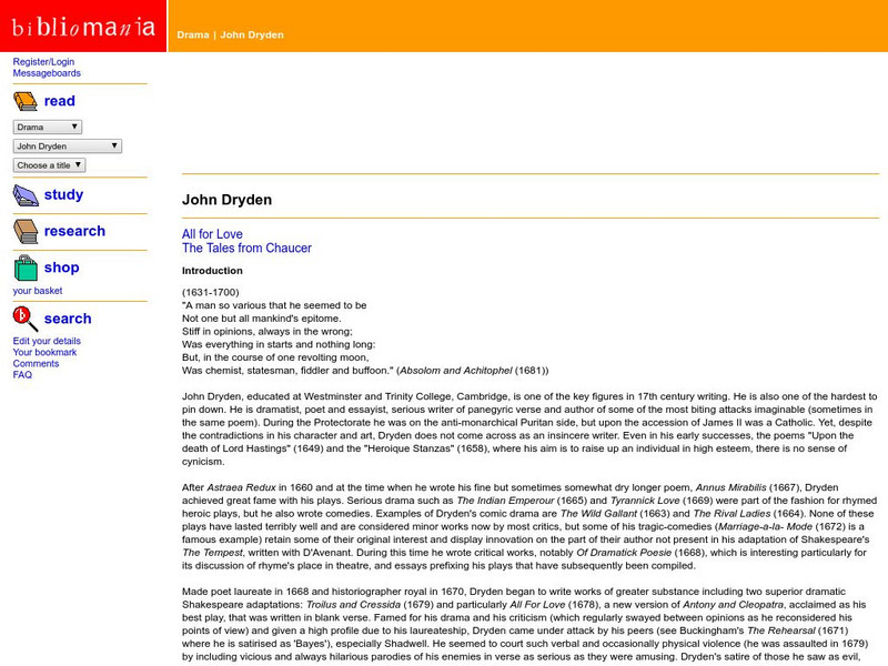 Here is a brief introduction to the life and career works of 17th century writer, John Dryden. Read about his most famous poems and plays, and read an excerpt from his "Absolom and Achitophel" (1681).