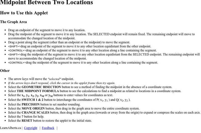 Find the midpoint between any two points using this java applet. The applet allows the user to pick any two points, see the segment and how the midpoint is found algebraically and graphically.