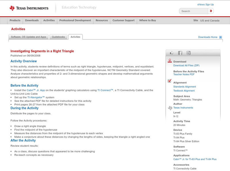 In this activity, students review definitions of terms such as right triangle, hypotenuse, midpoint, vertices, and equidistant. They also discover an important characteristic of the midpoint of the hypotenuse.