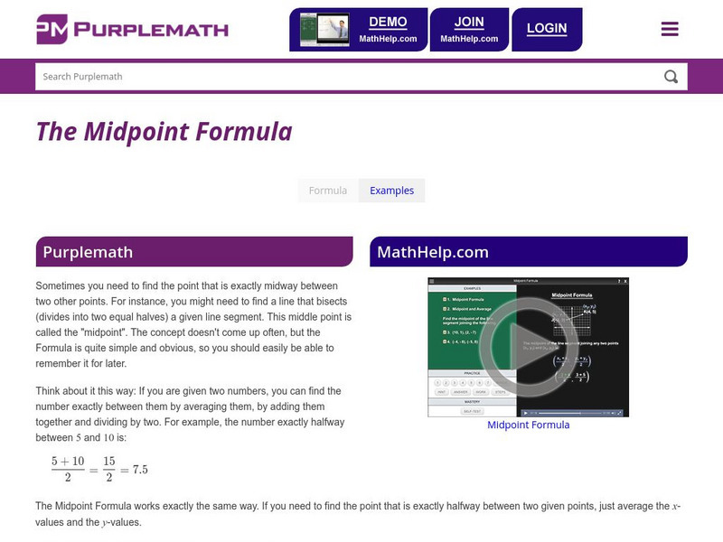 This lesson from Purplemath demonstrates how to use the Midpoint Formula and shows typical problems using the Midpoint Formula.
