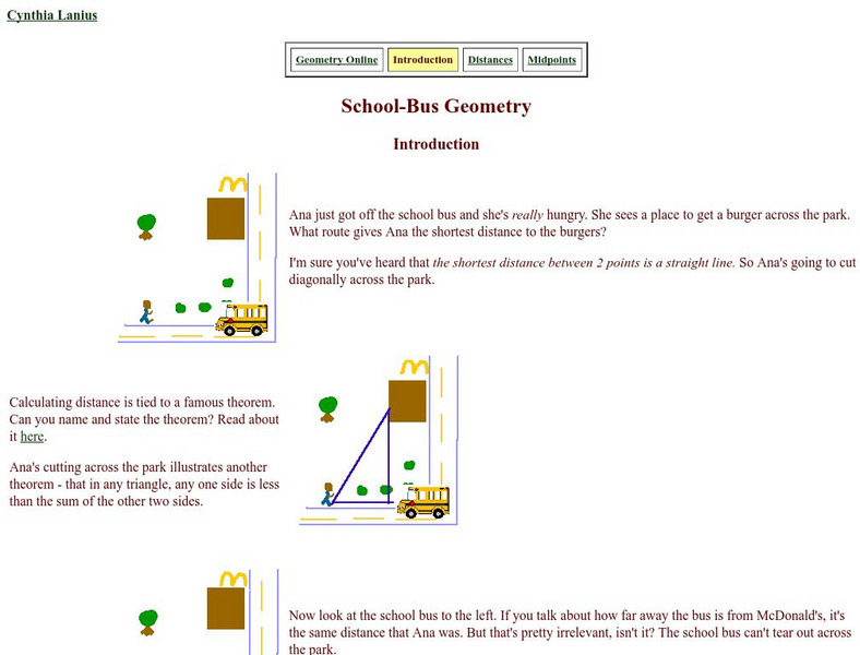 This site gives a lesson on school bus (Taxicab) geometry. The lesson includes distances and midpoints in taxicab geometry.