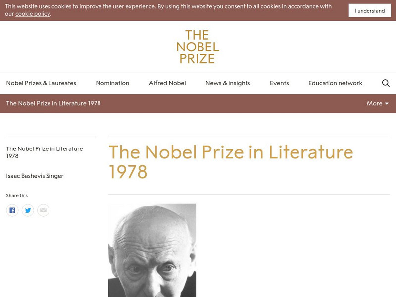 Learn about the 1978 winner of the Nobel Prize in Literature, Isaac Bashevis Singer. This website is organized into the following sections: "Presentation Speech," "Biography," "Nobel Lecture," "Nobel Diploma," and "Other Resources."