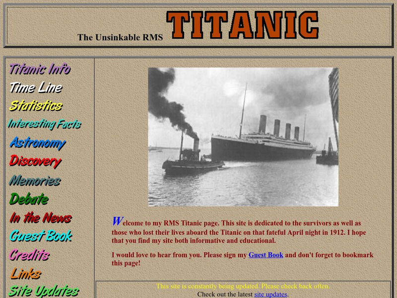 By a Titanic enthusiast, find a timeline, interesting facts, memories, and more concerning the fateful ship at this site.