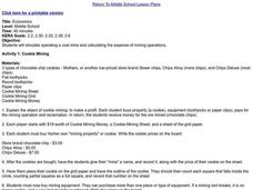 Students simulate operating a coal mine and calculating the expense of mining operations by choosing a chocolate chip cookie, buying tools to mine the chocolate chips and using paper money to pay for the expense of mining.