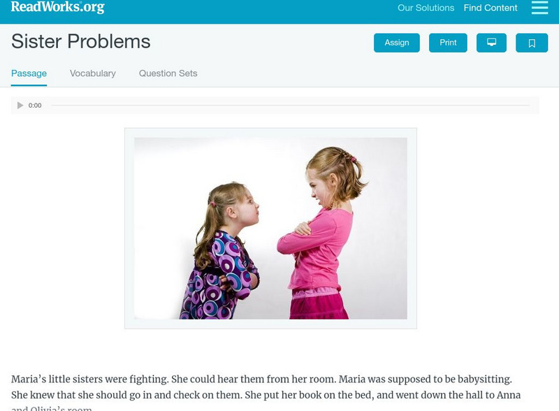 [Free Registration/Login Required] A literary text about a girl named Maria was had to babysit her two little sisters who often fought with each other. A question sheet is available to help students build skills in reading comprehension.