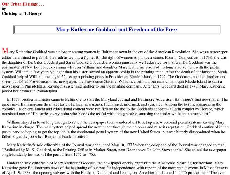 A brief and concise history of publisher and editor Mary Katherine Goddard. Goddard was an early activist and advocate of Freedom of the Press.