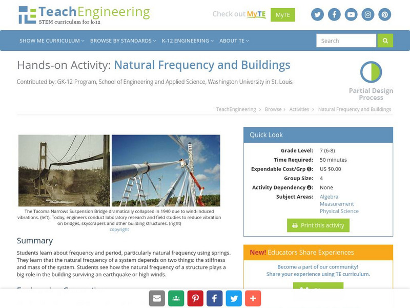 Students learn about frequency and period, particularly natural frequency using springs. They learn that the natural frequency of a system depends on two things: the stiffness and mass of the system. Students see how the natural...