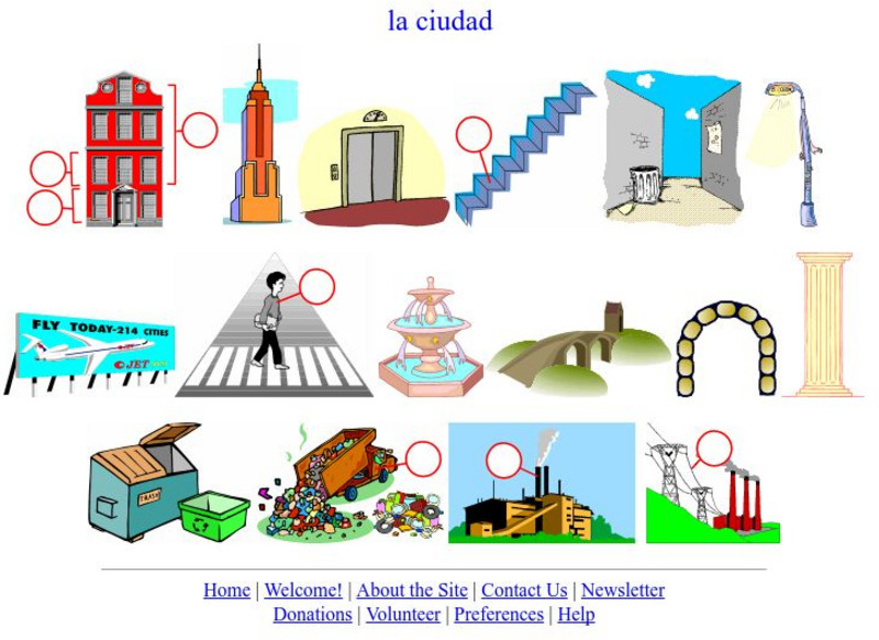 These colorful pictures and interactive vocabulary words cover things you might see when walking through a city. The correct Spanish pronunciation is heard when moving the mouse over each illustration.