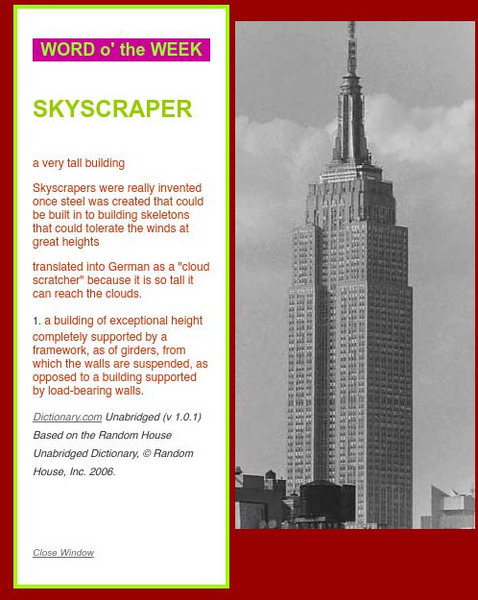 The "Word of the Week" from ArchKIDecture, a teacher-created site that encourages awareness of human-built environments, defines and illustrates the term "skyscraper."