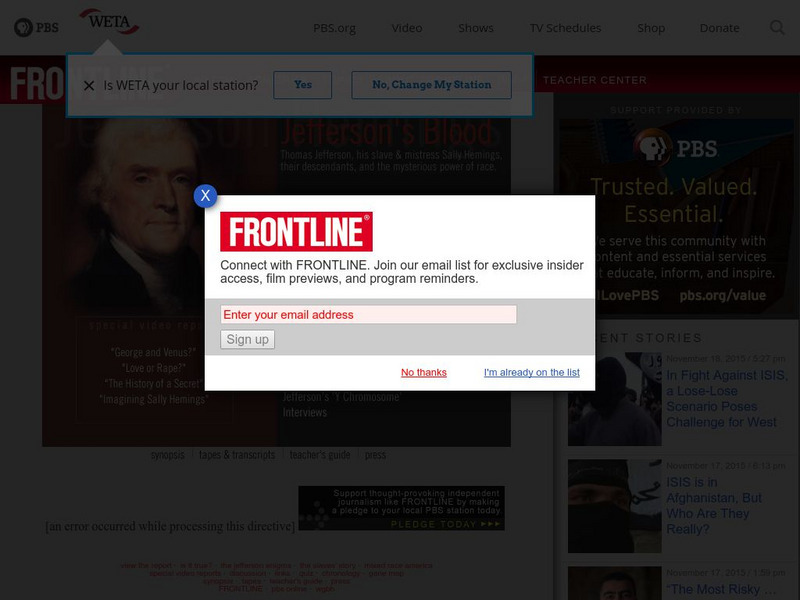 A website companion to PBS Frontline looks at Jefferson and his possible relationship with his slave Sally Hemings.