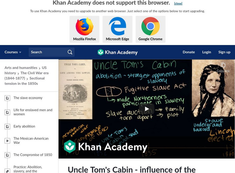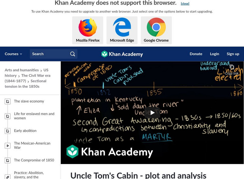 This Khan Academy resource provides a video lesson [6:19] that provides a plot summary and analysis of the book Uncle Tom's Cabin. This lesson emphasizes the impact of this book on American readers. The lesson is accompanied with a...