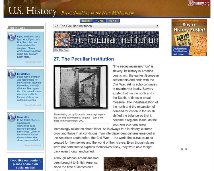 A very brief look at the "Peculiar Institution" of slavery in the South before the Civil War. Read about how slavery became so entrenced and why it drove a wedge between the North and South.