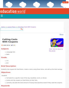 Students clip coupons for food items, create a menu using those items, and add up the total savings. They correctly calculate the total amount of money that would be saved if they used the coupons.